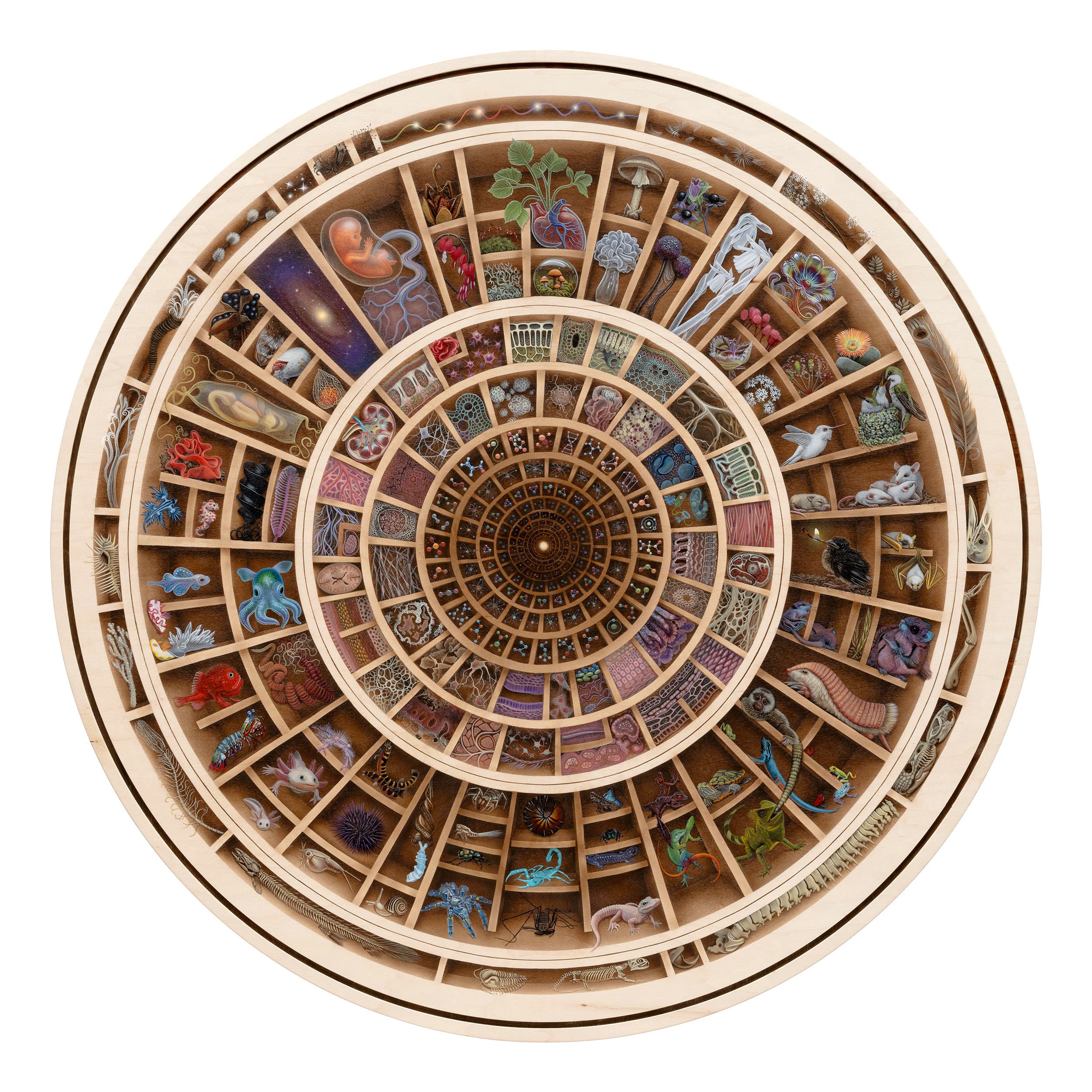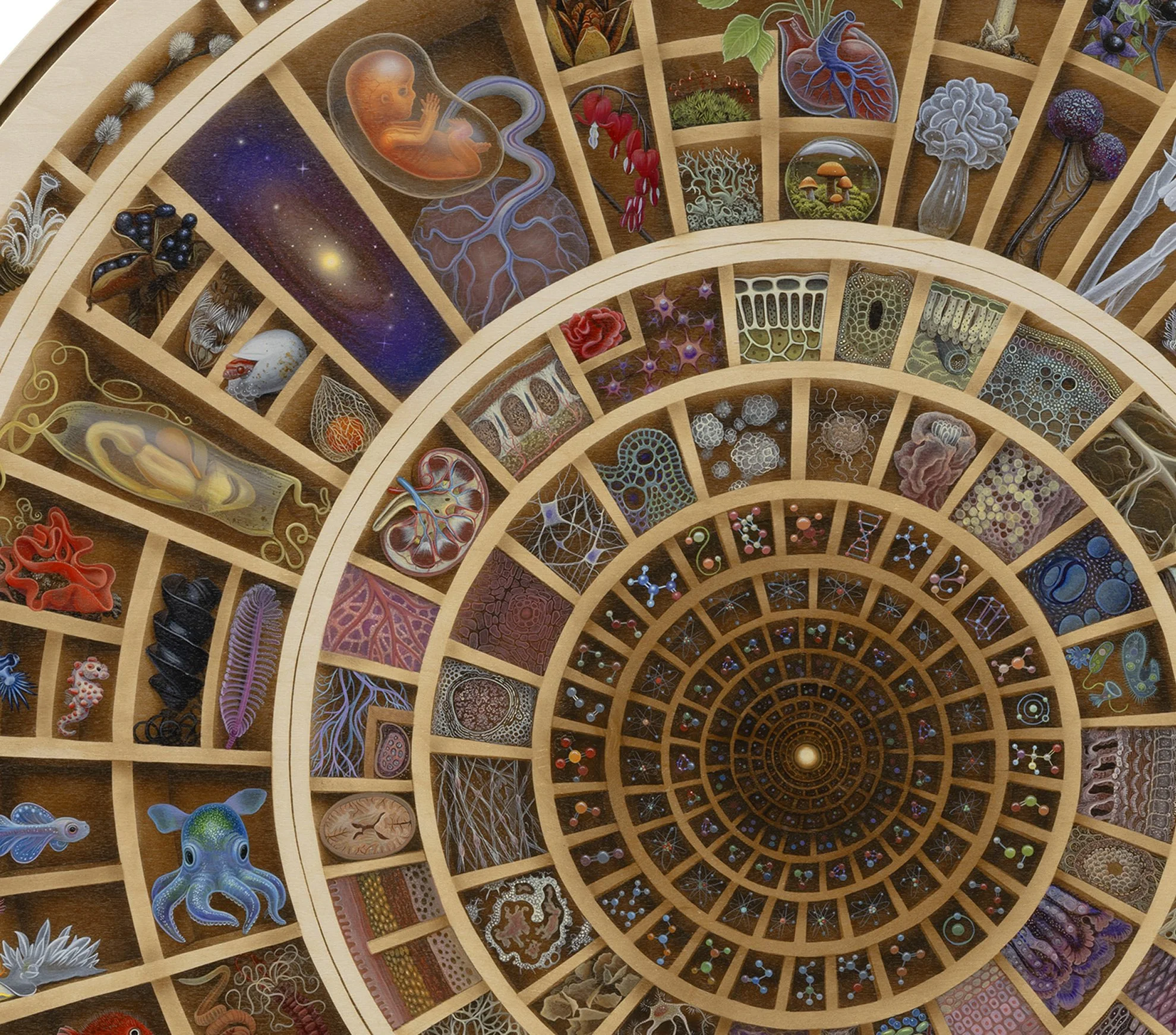 Structured as a mandala-like cross-section of life, Cabinet of Curiosities begins at the smallest scale—subatomic particles and cells at the center—before expanding outward into tissue, organs, and fully formed organisms. The outer ring gathers flora, fauna, a human fetus, and a distant galaxy, suggesting that all life shares a common structure and material origin.