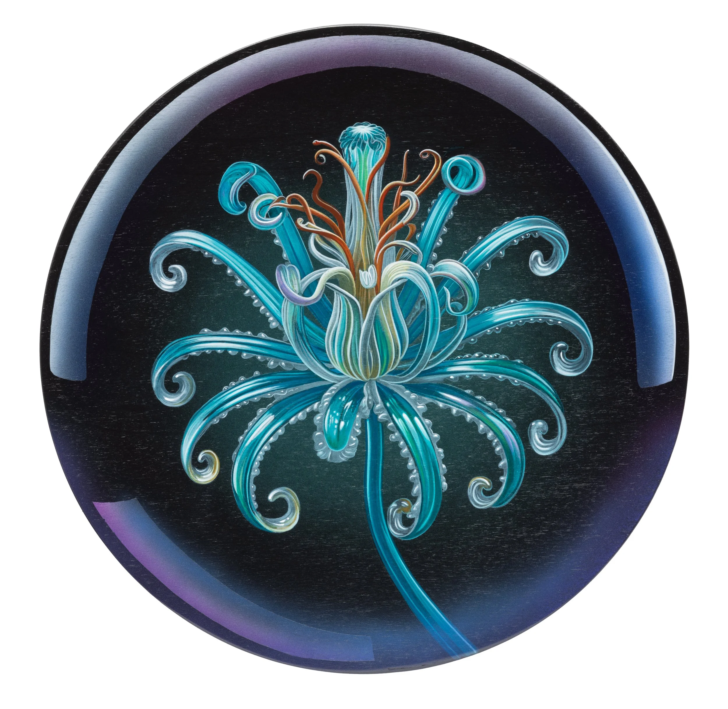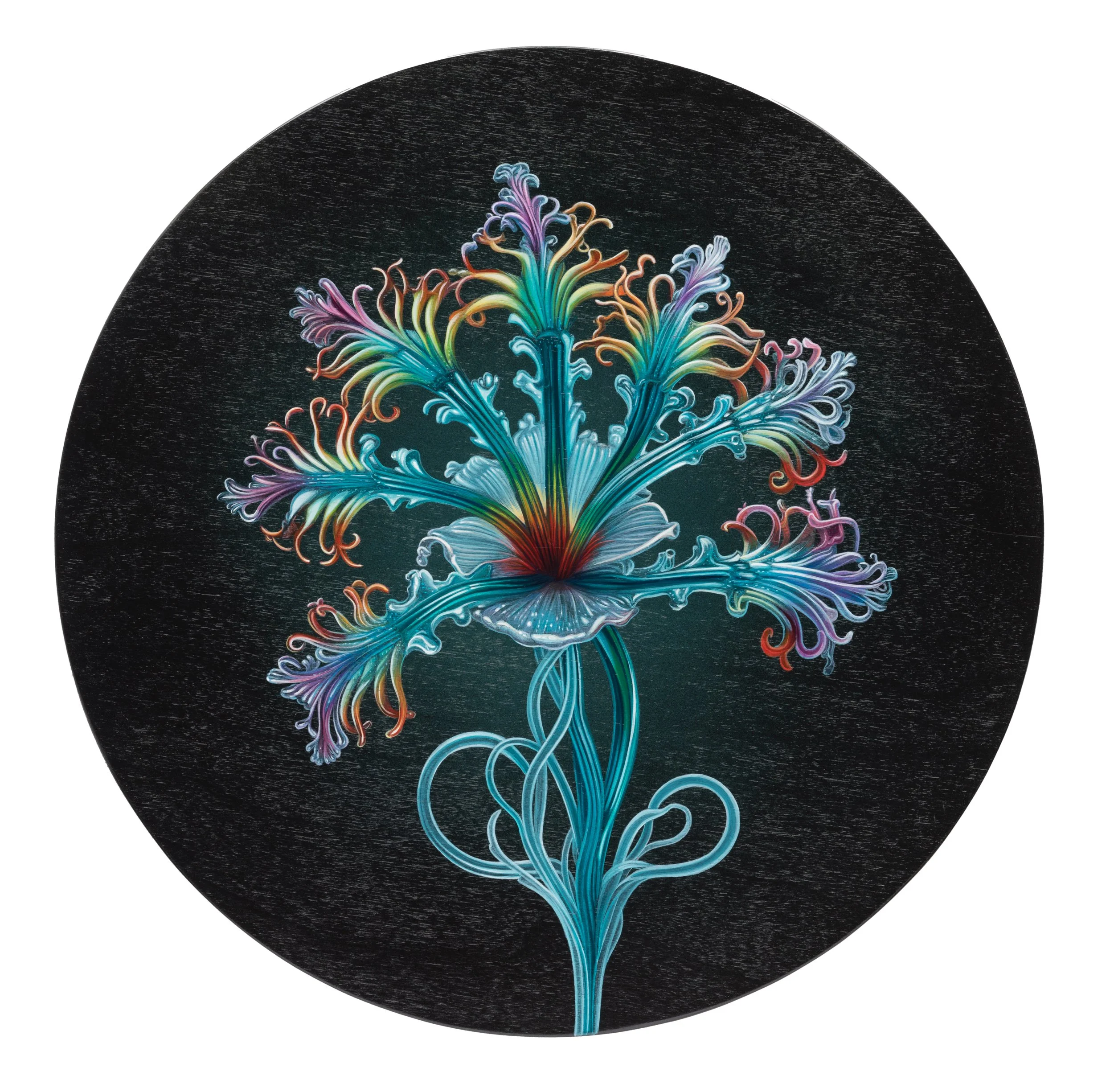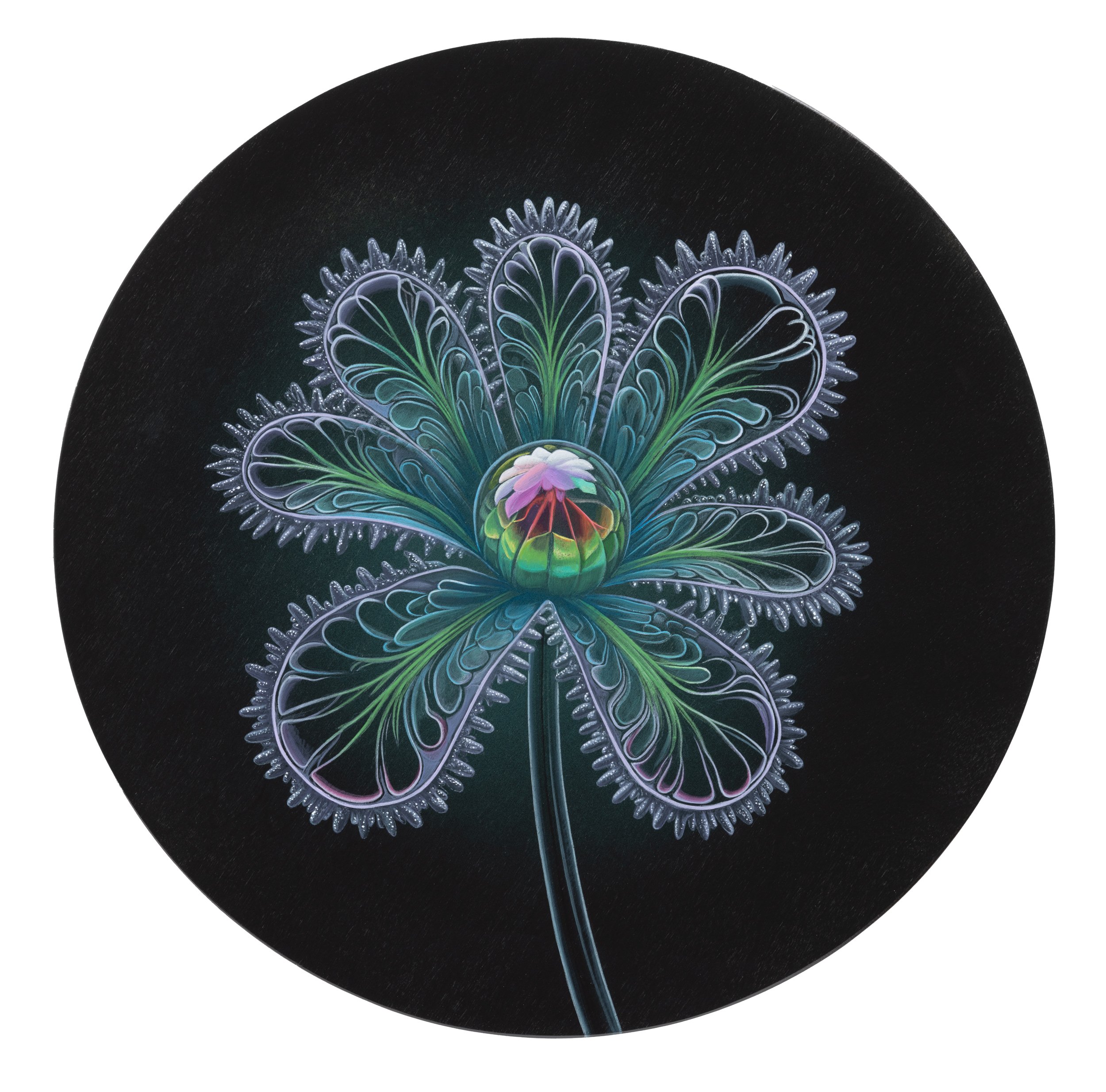 These paintings belong to a group of eight imagined blooms, each following its own internal botanical logic. Their forms unfold in precise, glasslike strands—some held within luminous spheres, others opening outward in intricate, organic patterns that echo deep-sea or microscopic life.