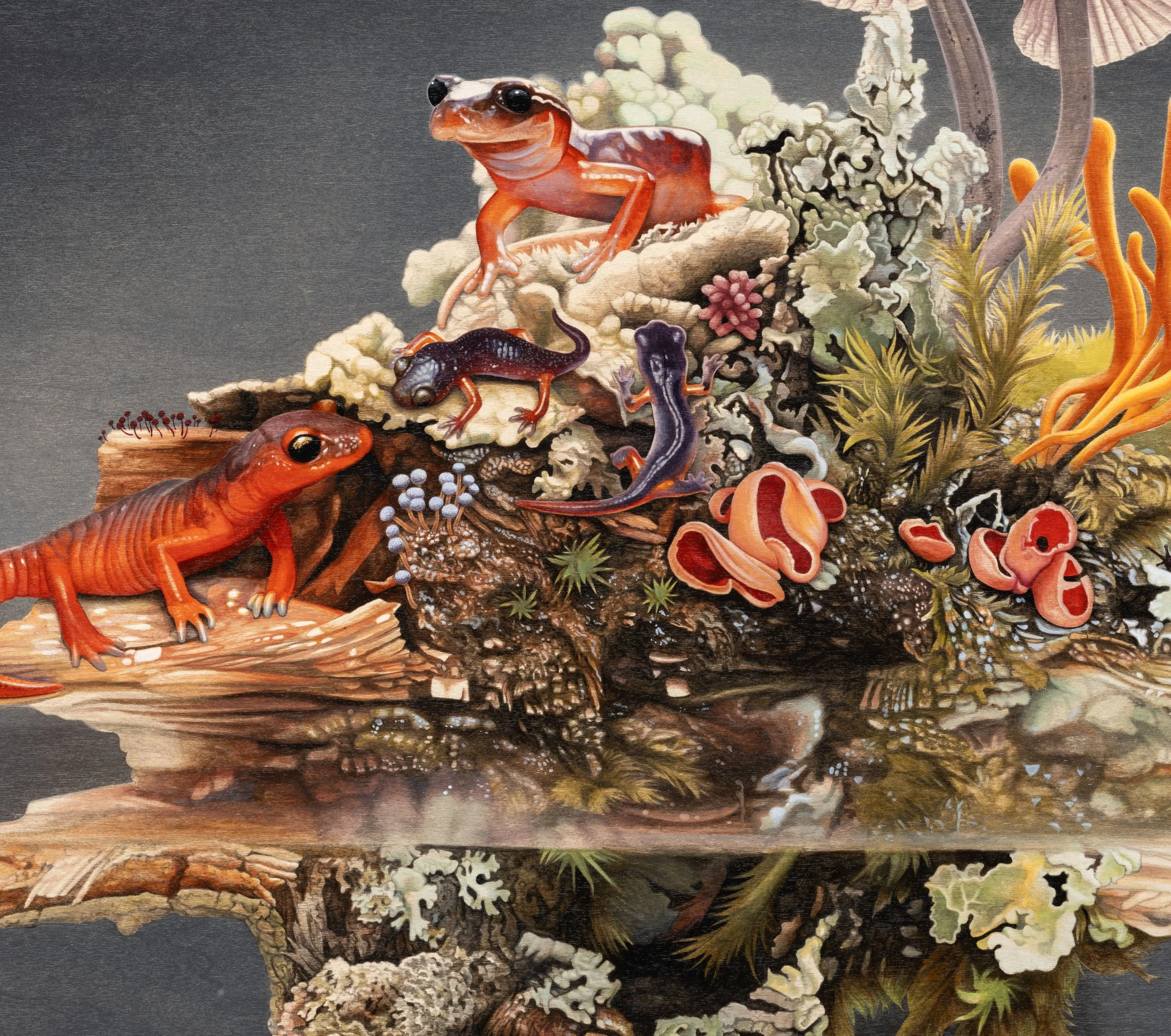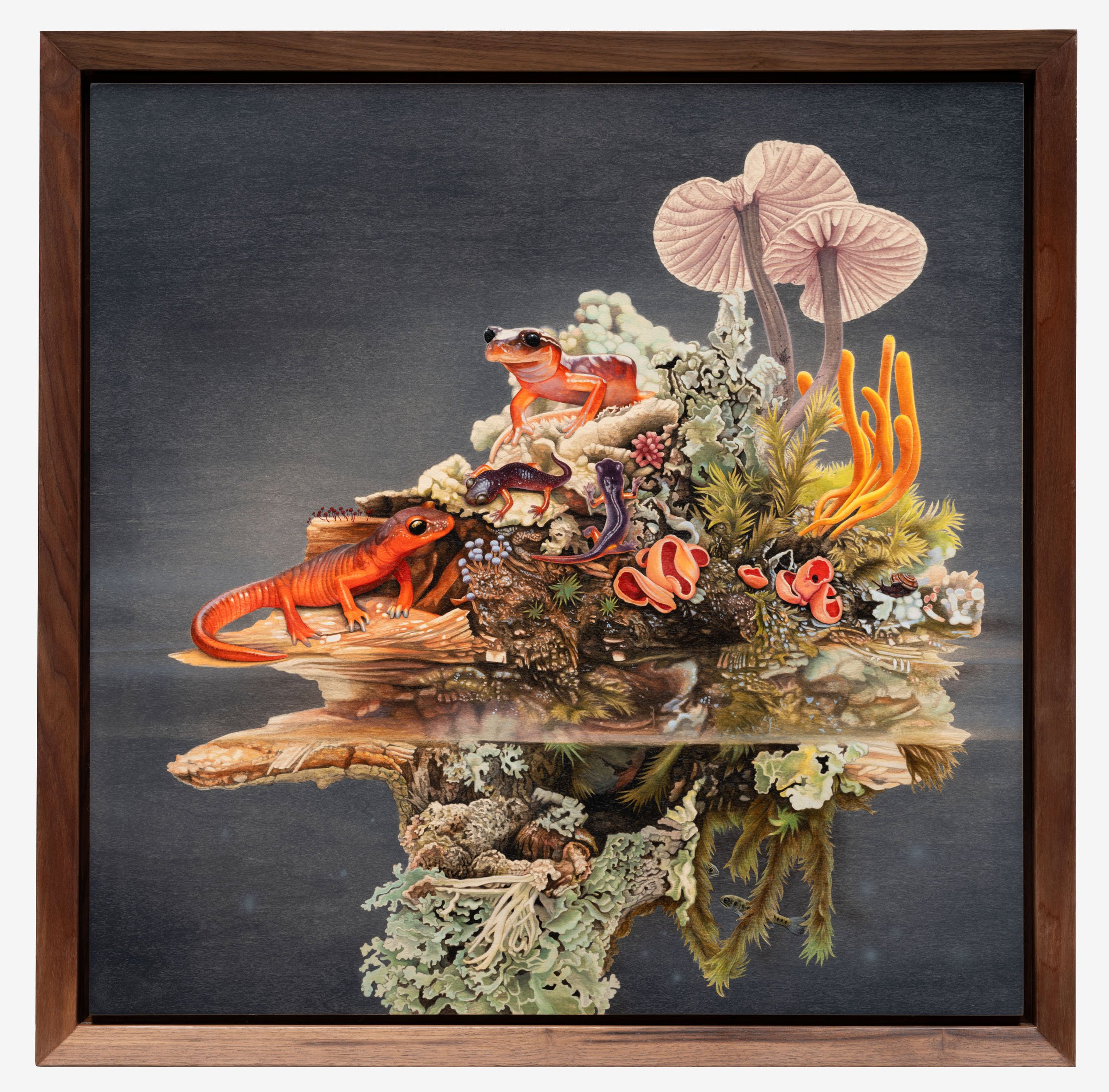 The piece centers on a floating island of native species, reflected in dark water and held in a delicate balance. Salamanders, often overlooked, are key indicators of environmental health, revealing how even subtle changes in habitat can ripple outward.